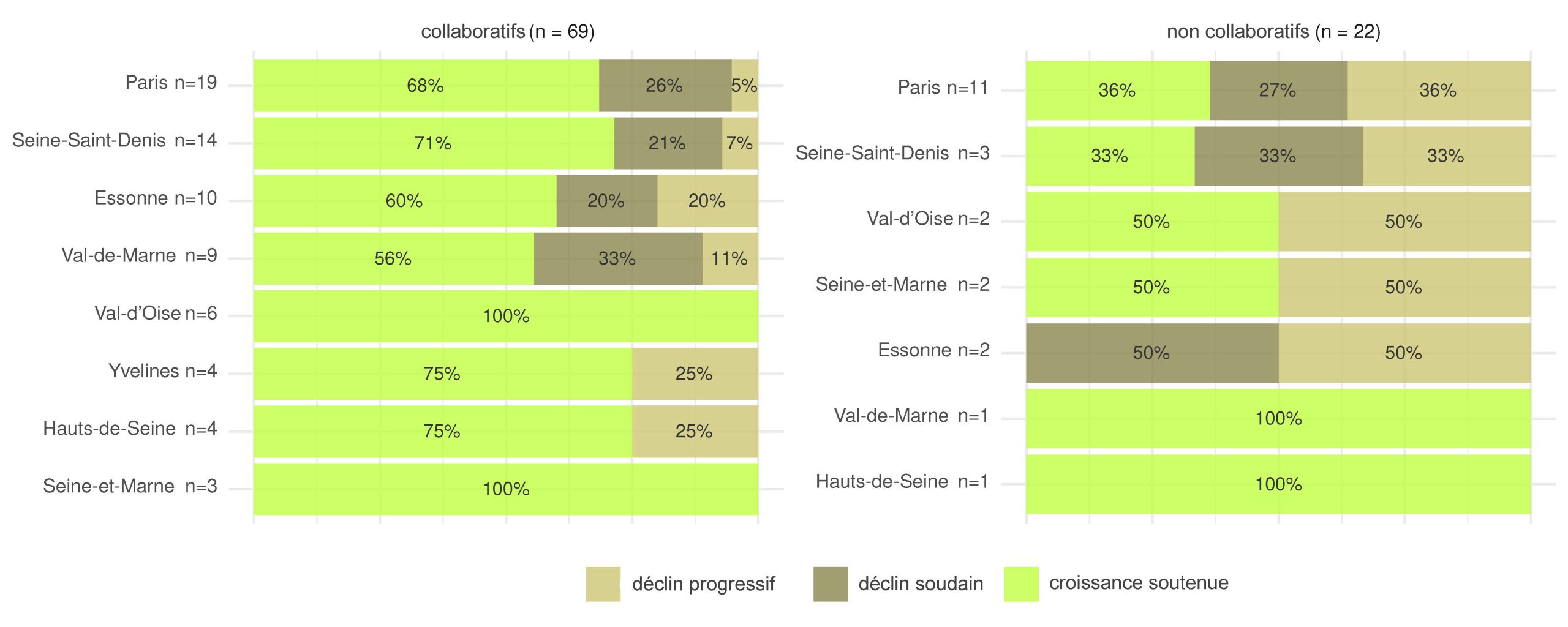 Figure 8. Répartition des étoiles montantes dans chaque type d’évolution de taille d’audience, par département en Île-de-France, différenciée selon le profil de collaboration artistique.