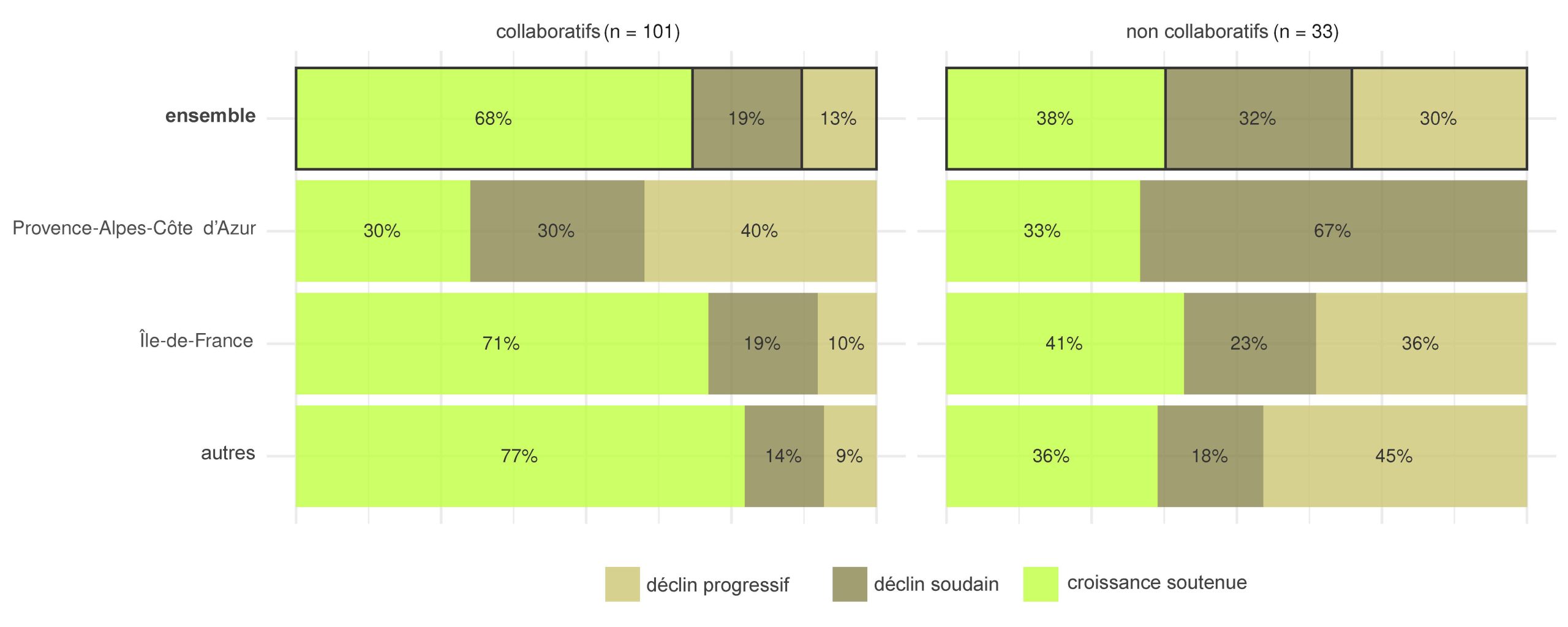 La classification des artistes de cette étude en trois profils distincts (déclin soudain, déclin progressif et croissance soutenue) conduit à une réduction rapide des effectifs par département. Pour pouvoir disposer d’échantillons suffisants et tirer des conclusions statistiques robustes, et approfondir par là l’analyse de la longévité de la réussite, il est donc nécessaire d’agréger les données à un niveau administratif supérieur, celui de la région. Ce choix méthodologique, bien qu’éloigné de l’échelle départementale privilégiée par la littérature, est indispensable pour garantir la fiabilité des analyses statistiques. Ainsi, je regroupe, dans la figure 7, les artistes en trois catégories, en suivant la hiérarchisation des espaces mise en évidence dans la littérature et dans cette étude : l’Île-de-France en tête (n = 69 pour les collaboratifs et n = 20 pour les non-collaboratifs), suivie de la région Provence-Alpes-Côte d’Azur (n = 10 pour les collaboratifs et n = 3 pour les non-collaboratifs), puis le reste de la France, les grands centres urbains dits périphériques (n = 22 pour les collaboratifs et n = 10 pour les non-collaboratifs)[42].