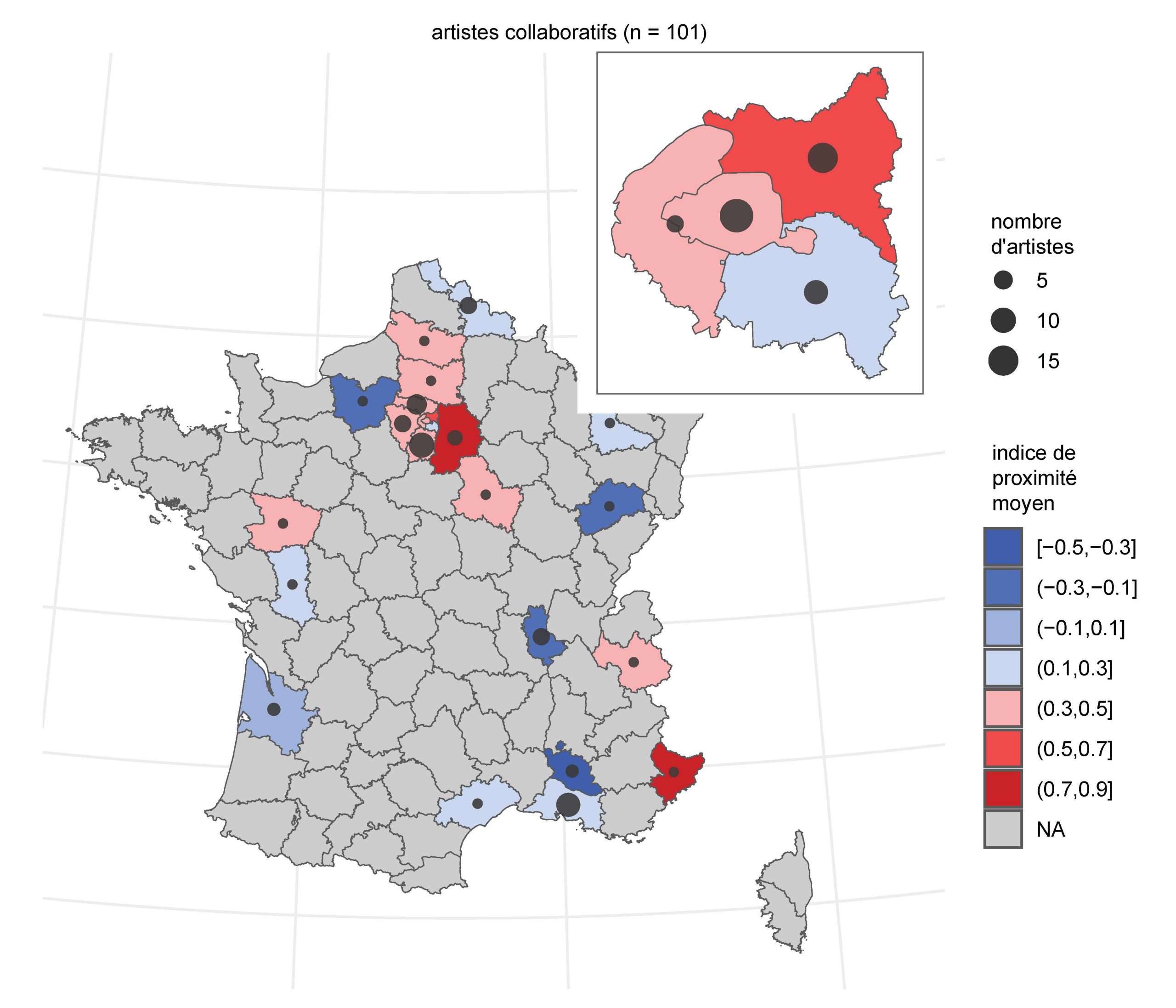 [42] Les artistes qui ne s’engagent pas visiblement dans des dynamiques de mise en réseau sont principalement situés à Paris.