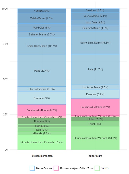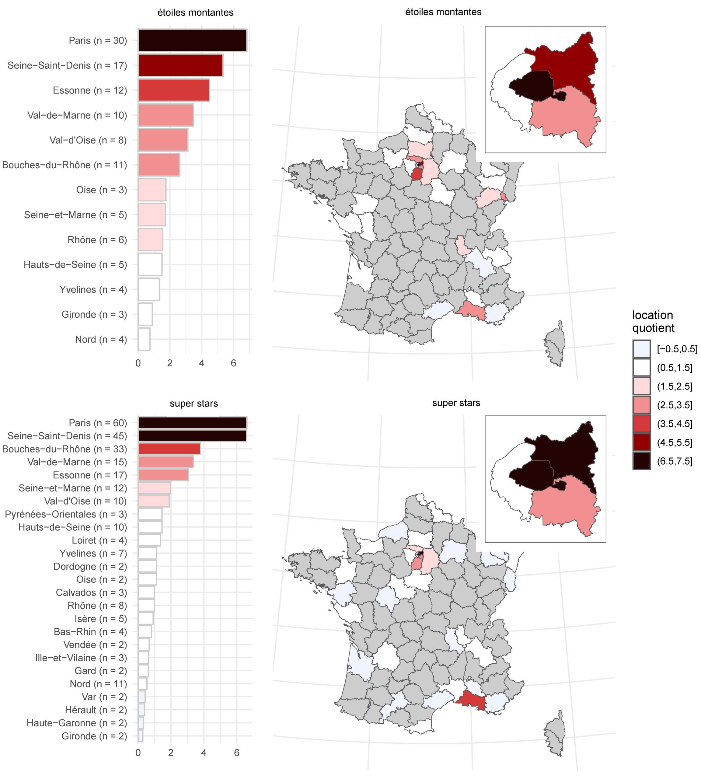 Figure 5. Sur- et sous-représentation des étoiles montantes et des superstars par département en France métropolitaine[34].