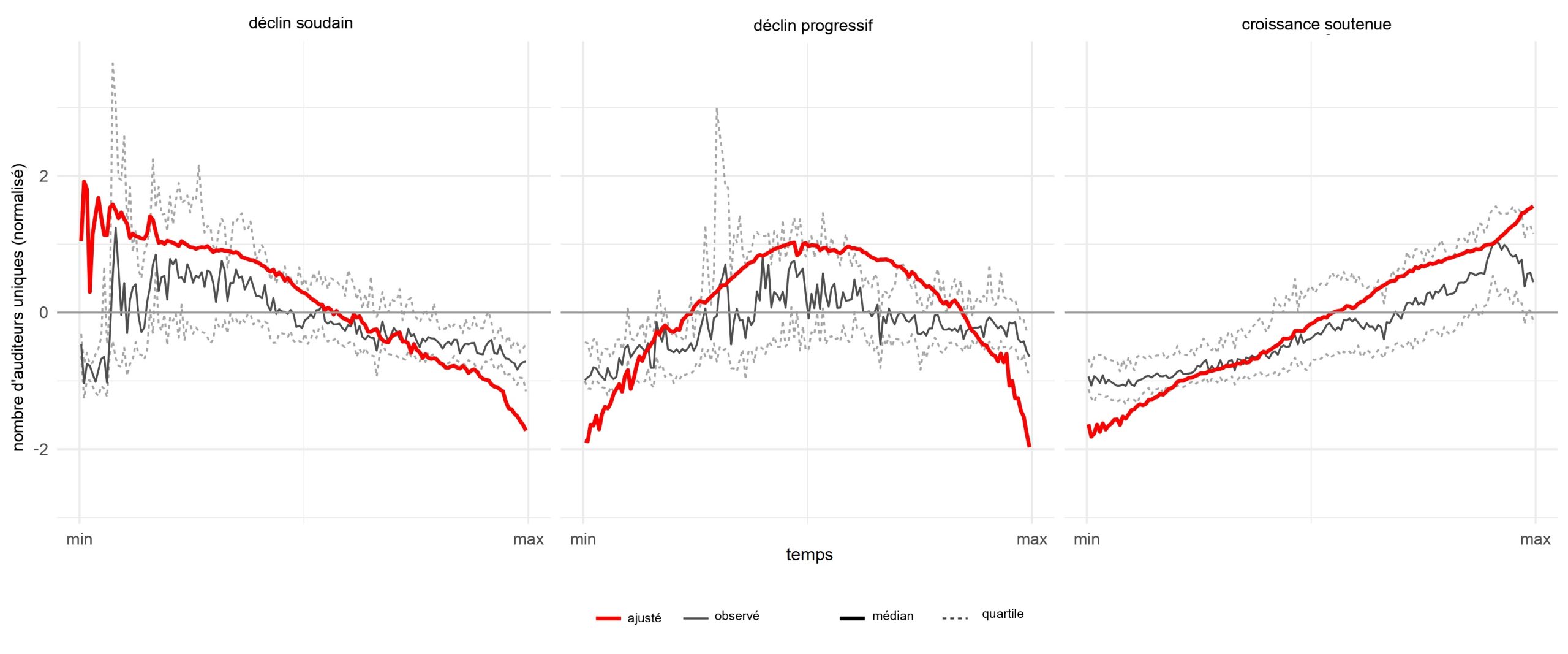 Figure 3. Évolution de la taille de l’audience médiane des étoiles montantes selon la typologie construite et sur la période d’observation (janv. 2020-déc. 2022).