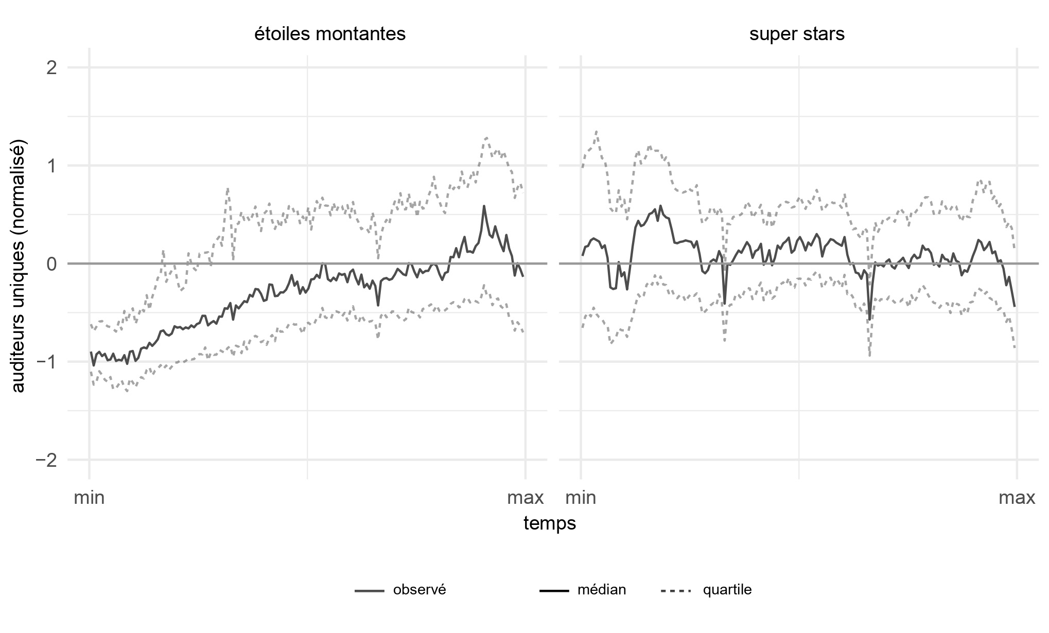 Figure 1. Évolution médiane de la taille de l’audience des étoiles montantes et des superstars sur la période d’observation (janv. 2020-déc. 2022).
