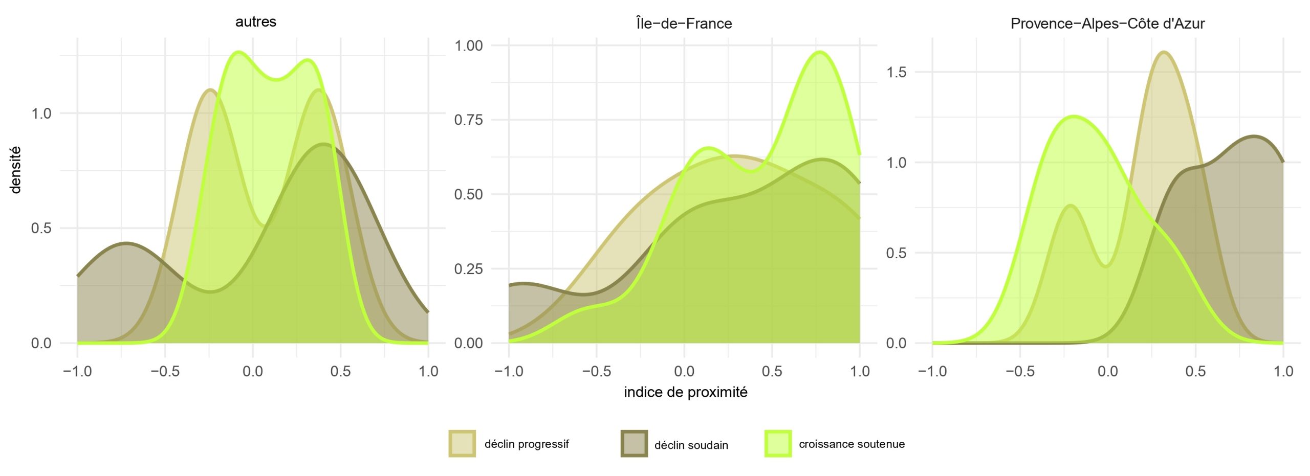 Figure 11. Distribution de l’indice de proximité des collaborations artistiques des étoiles montantes, par région et par type d’évolution de taille d’audience.