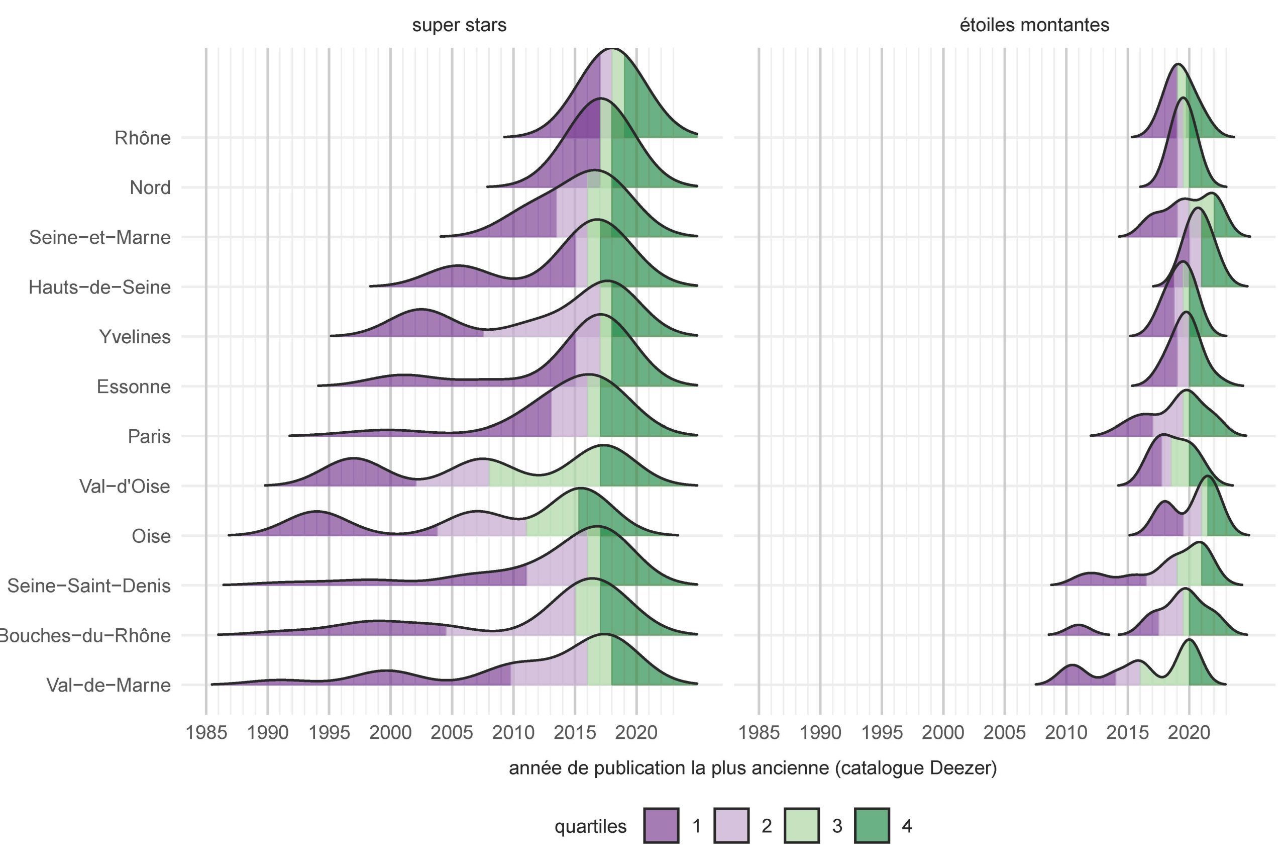 Figure 6. Volume des premiers morceaux sortis par année et par département dans le corpus Deezer des étoiles montantes et des superstars.