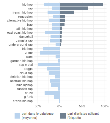 Près de 100 % des artistes ont produit au moins un morceau étiqueté « hip-hop ». Cette étiquette occupe en moyenne autour de 30 % du catalogue de ces artistes.