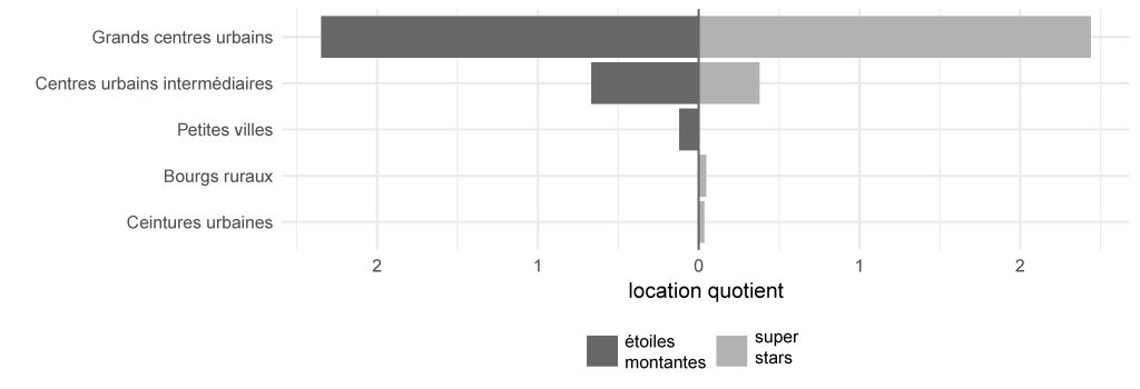 Pour mettre en lumière le degré de concentration des artistes dans les différents territoires qui constituent l’espace français, je rapporte la part d’artistes d’un territoire donné à la part de sa population dans l’ensemble national. Ainsi, un indice (location quotient) supérieur à 1 indique une présence plus forte que prévu, tandis qu’un indice inférieur à 1 révèle une sous-représentation par rapport à cette répartition dite attendue. La littérature souligne le fort ancrage urbain des artistes du rap en France métropolitaine[30]. Comme le montre la figure 4, à l’échelle de la commune, les superstars et étoiles montantes sont particulièrement concentrées dans la catégorie des « grands centres urbains[31] », le niveau le plus élevé d’urbanité, avec plus de deux fois plus d’artistes qu’attendu.
