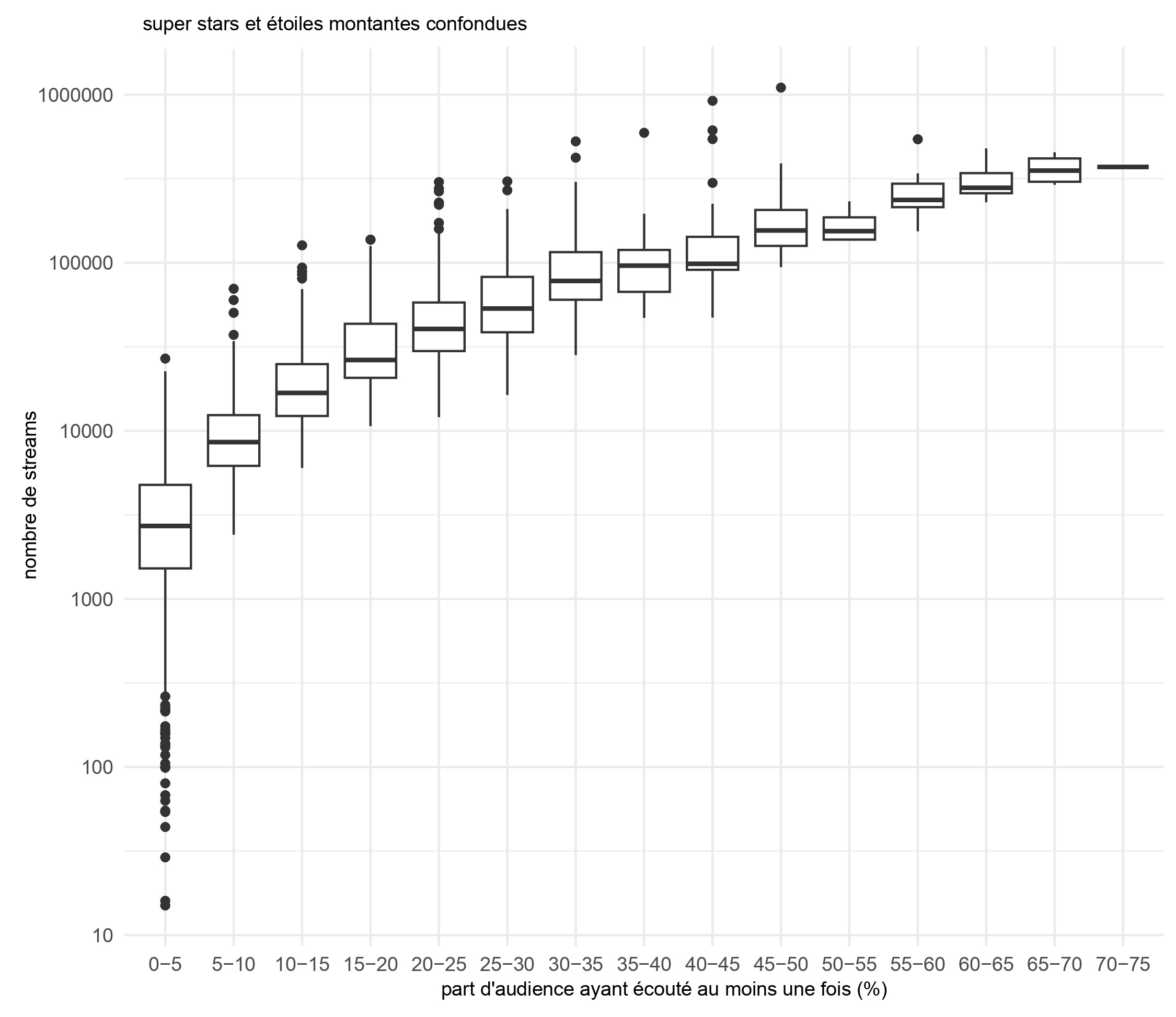 Le nombre de streams organiques des artistes ayant été écoutés par 5 à 10 % des auditeurs de l’échantillon varie entre 3 000 et 100 000, avec une médiane à 1 000. Dans cet intervalle, les artistes les plus populaires sont 33 fois plus streamés que les artistes les moins populaires.