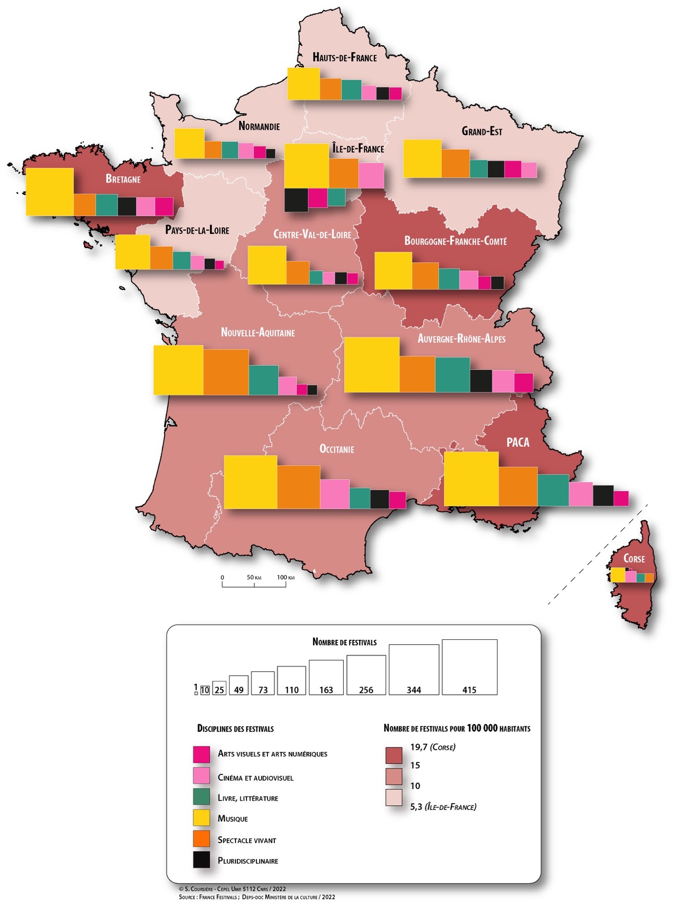 Carte 1. Les disciplines des festivals selon les régions. Source : France Festivals ; DEPS, 2022[23]. Réalisation : S. Coursière, 2022.