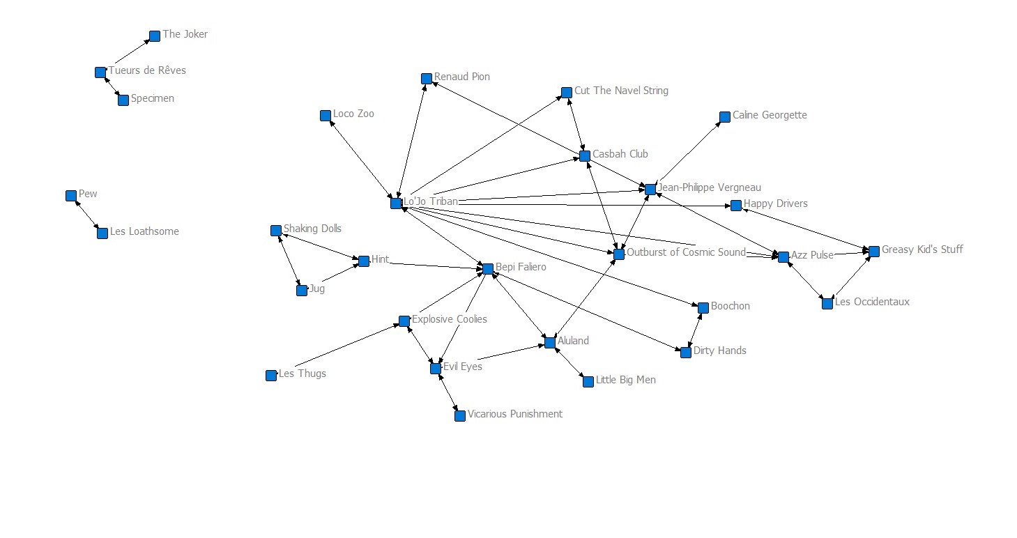 Notes : Un lien entre deux groupes signifie qu’au moins un musicien a joué dans les deux groupes reliés. Parmi les groupes présents sur le graphique, ceux qui ont publié au moins un titre sous le label Black & Noir en 1994 ou avant sont Bepi Faliero, Casbah Club, Dirty Hands, Explosive Coolies, Hint, Shaking Dolls et Les Thugs.