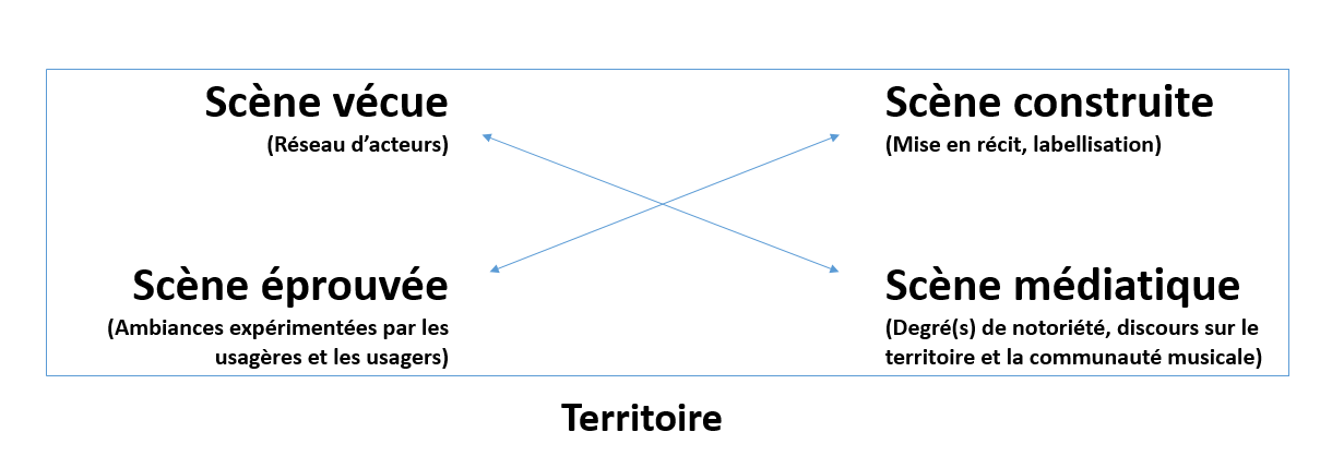 • la scène médiatique : le type de visibilité et les représentations de la musique sur un territoire proposés par les médias (quelle que soit leur forme) à différentes échelles.